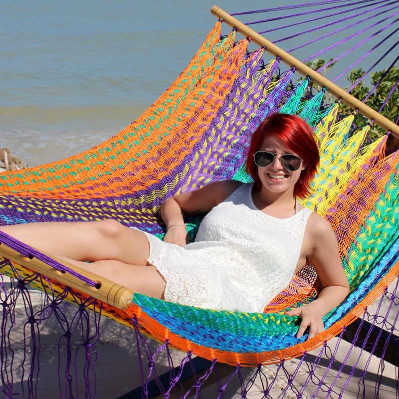 Double hammock in Nylon Net with spreader bars Ships within 1-3 days Before180,00Price for køb af 1 Stk,139,00 EUR(incl. VAT) Amount Buy Weatherproof double hammock in nylon net with spreader bars 120 cm width spreader bars. Material: Nylon Net Total 3.80 meter Max 2 persons Max Load 250 kg Nice hammock for cozy and sun bathing. Item no.: YUC24-140 Related products GRINGA - American comfort net hammock. Highly popular #40-18 EUR 575,00475,00 American hammock ANA with spreader bars and Thick Cord in Colorful design EUR 145,00 Multicolored hammock chair in net. No. 43MX-ANA EUR 95,00