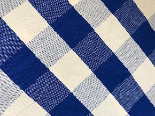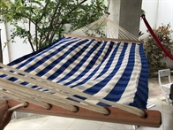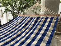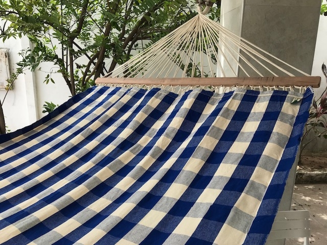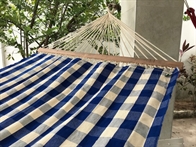 Hammock in a trendy squared fabric with blue and off white squares.
